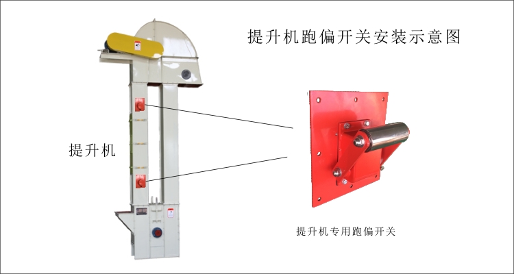 安裝調(diào)整:本產(chǎn)品安裝在提升機(jī)外罩機(jī)架上, 1. 提升機(jī)跑偏開(kāi)關(guān)提升機(jī)外罩上下兩側(cè),立輥應(yīng)與垂直膠帶機(jī)成十字交叉,并使輸送帶兩邊位于立輥中間位置。 2. 跑偏開(kāi)關(guān)數(shù)量應(yīng)根據(jù)輸送機(jī)長(zhǎng)度、類型及布置情況進(jìn)行確定。一般應(yīng)在提升機(jī)頭部、尾部左右各安裝一個(gè),3.跑偏開(kāi)關(guān)安裝在提升機(jī)外罩的鐵皮上,如鐵皮太薄需在外面安裝10cm厚度固定鋼板,確保提升機(jī)運(yùn)行過(guò)程中跑偏開(kāi)關(guān)未晃動(dòng)。4.提升機(jī)跑偏感應(yīng)行程可根據(jù)現(xiàn)場(chǎng)需求進(jìn)行調(diào)節(jié),無(wú)特殊情況無(wú)需重新調(diào)節(jié)。